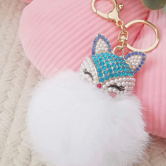 Multi-Colored Sapphire, Cubic Zirconia And Pearl Super Cute Fox Head Faux Fur Puffy Pom Pom Keychain