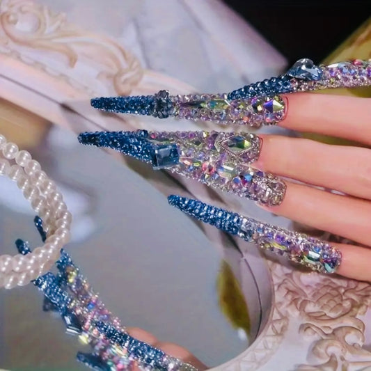 Blinged Out Long 3D Chrystal Coffin Style Reusable Press On Nails.