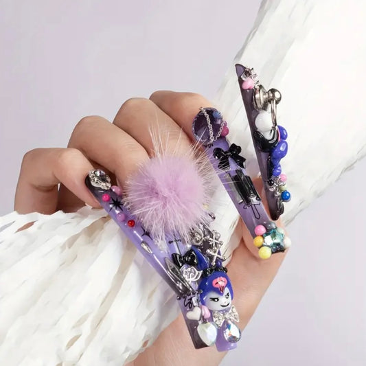 Handcrafted Kawaii Sanrio Press-On Nails – Extra Long Square Tips with Multicolor Bling & 3D Charms