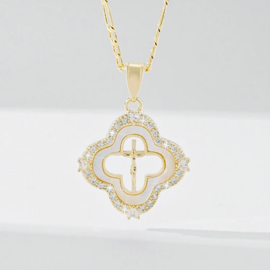 14k Vermeil Gold Cross Necklace with Mother of Pearl Shell & Crystal Studded Accents
