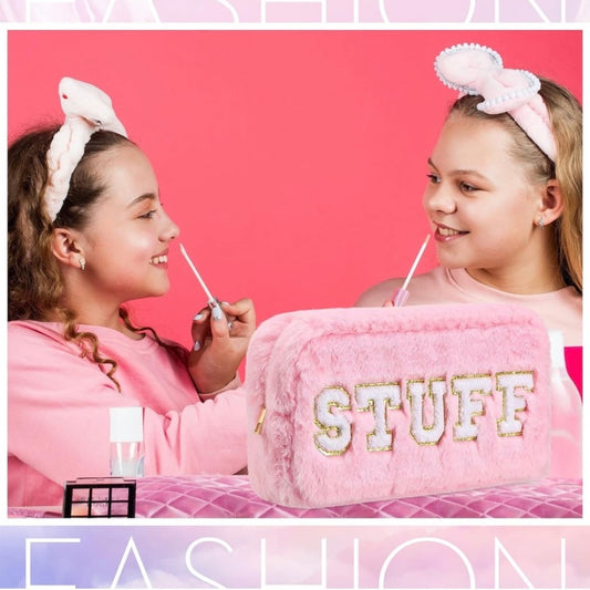 Rosa oder weiße Schminktasche aus Plüsch mit Glitzerschriftzug | TSA-zugelassene Kosmetiktasche