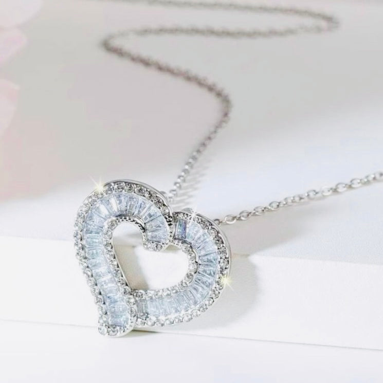 Diese zeitlosen Edelsteine aus Kristall, Zirkonia und makellosem Saphir im Diamantschliff sind in einem herzförmigen Anhänger aus Weißgold eingefasst und gruppiert, der an einer 20 Zoll langen, diamantgeschliffenen Wasserwellenkette aus Sterlingsilber hängt und garantiert jedermanns Herz erobert, auch Ihres vor Ort!