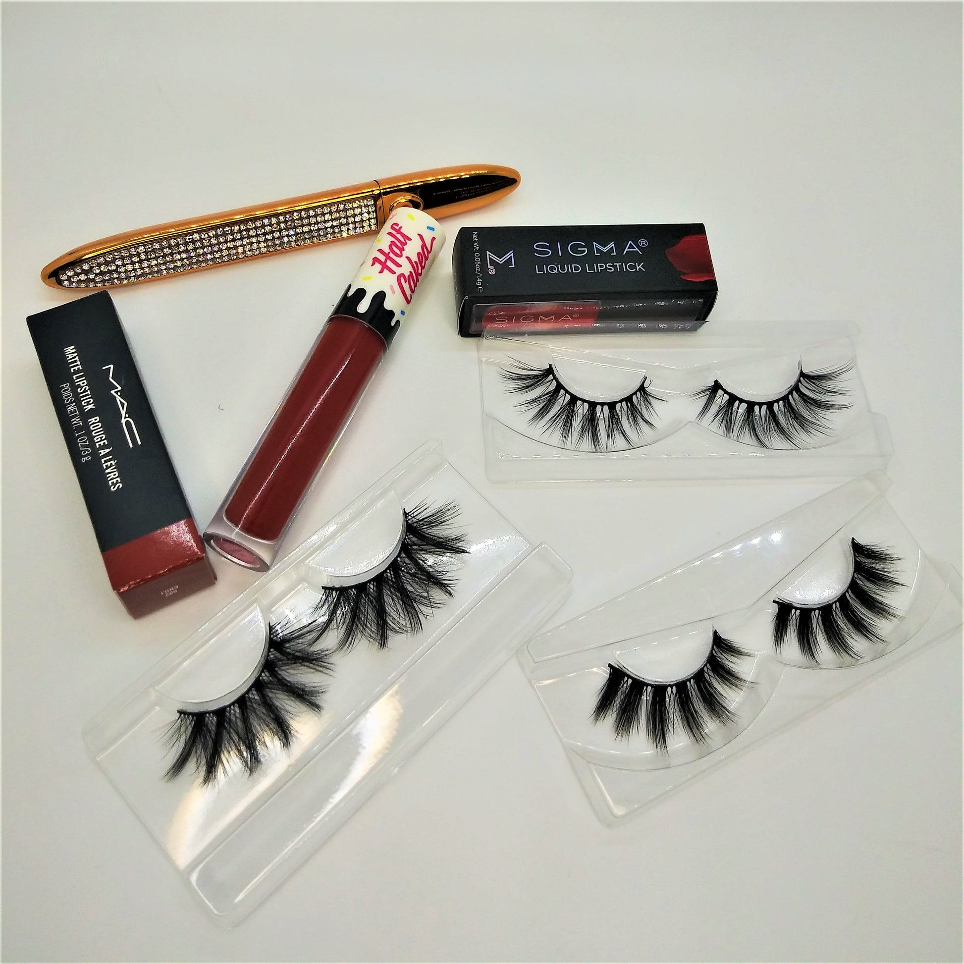 Sie erhalten 3 Premium-Designer-Lippenstifte in Originalgröße – vollständig anpassbar an Ihre gewünschte Farbe – und 3 Paar komplett natürliche, vegane Wimpern, die ebenfalls an Ihre gewünschte Länge anpassbar sind.
