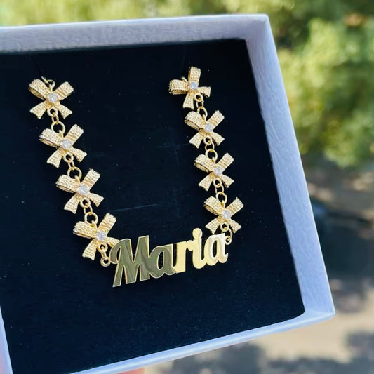 14K Gold Vermeil Custom Name Necklace & Bracelet Set | CZ Bow Charm Jewelry