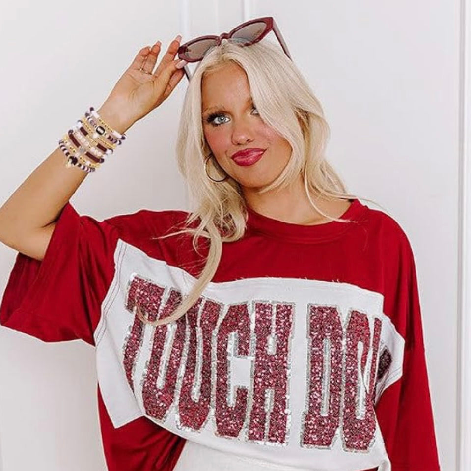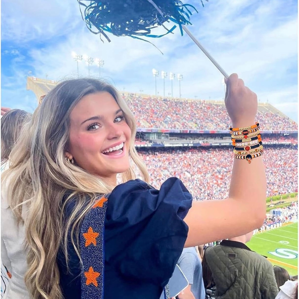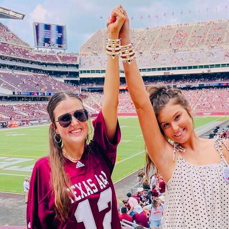 Get ready to cheer in style with this playful multi-color set of 8 stackable friendship bracelets, decked out in maroon, white, and gold beads. Each bracelet features fun football-themed charms like a helmet, a football, and “GAME DAY” lettering—perfect for showing off your team spirit in any color.