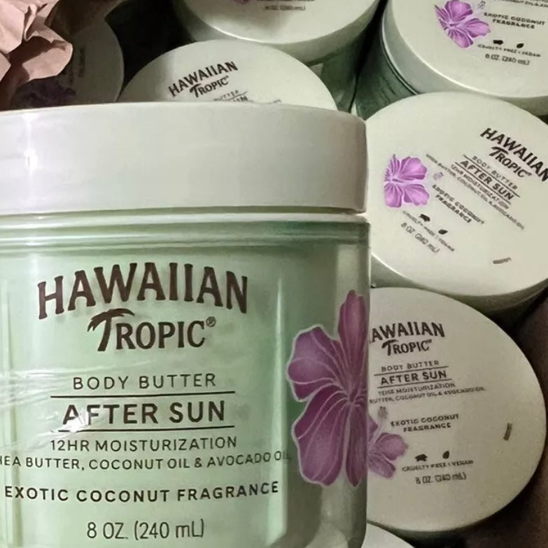 Enjoy a luxurious beach day with Hawaiian Tropic Exotic Coconut After Sun Creamy Body Butter. Formulated with All Natural Botanicals, Omegas, Raw Shea butter,Pure Coconut butter, Avocado butter and Vitamin E, your skin will be left deeply nourished and hydrated to the max for an entire 24 hours.