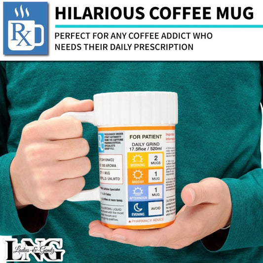 Taza de café divertida con botella recetada | Cerámica | 17,5 onzas XL | Regalo para ella, él, esposa, compañera de trabajo.