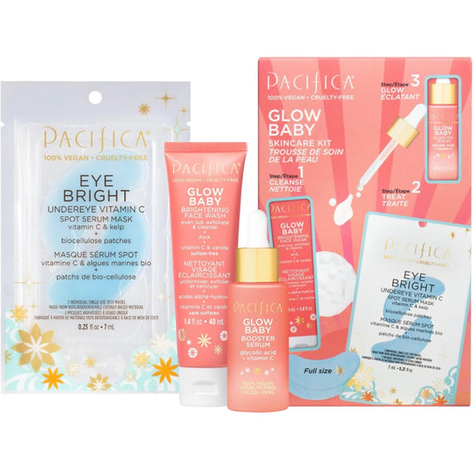 Pacifica Glow Baby Suero potenciador de vitamina C, lavado facial iluminador + paquete de máscara de algas para ojos brillantes