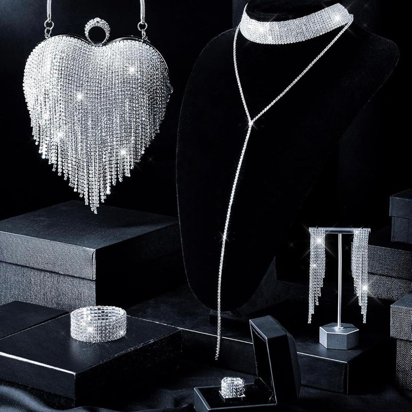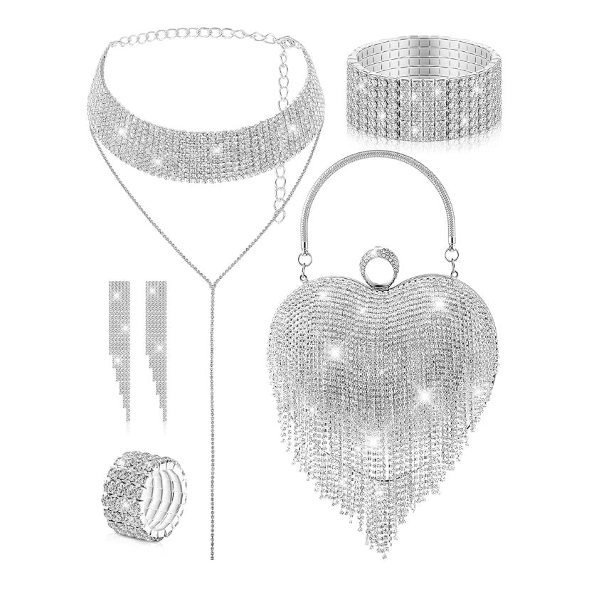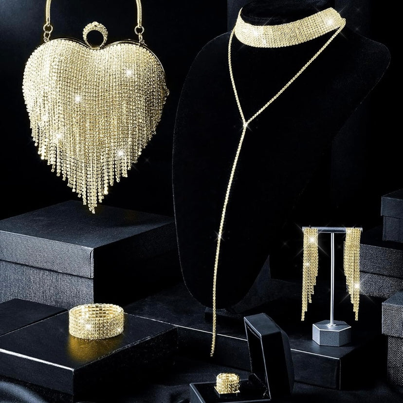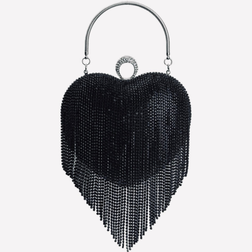 Presentamos nuestro bolso de mano con borlas de diamantes brillantes en forma de corazón, un accesorio perfecto para una salida nocturna con las damas o una cita. Este elegante bolso de noche está diseñado para llamar la atención y mostrar su amor por las joyas importantes. La bolsa está fabricada con materiales de alta calidad y está diseñada para durar. El exterior brillante brilla tanto que llamará la atención de todos. El bolso está disponible en dos colores: “ Pasion Pink Punanny ” y “ Gold Digger Diamond ”.
