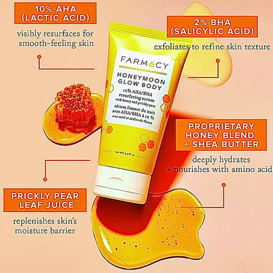 Suero rejuvenecedor Farmacy Honeymoon Glow Body AHA/BHA | Tamaño completo 4,7 onzas.