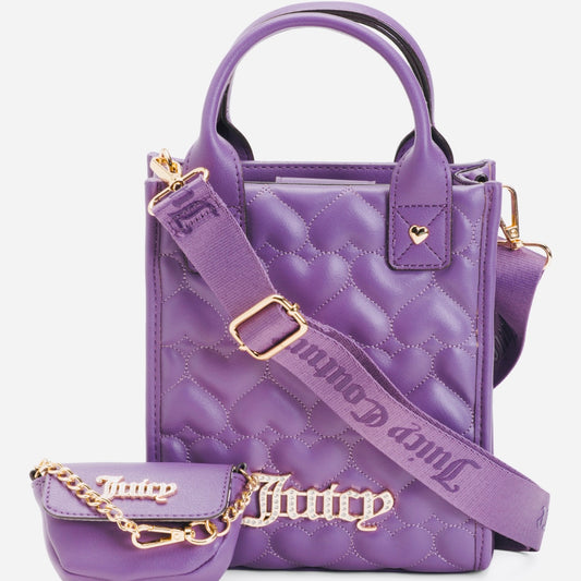 Juicy Couture 3 Piece Purple Heart Stitched Tote Cross Body Bag w/Coin Purse + Adjustable Strap