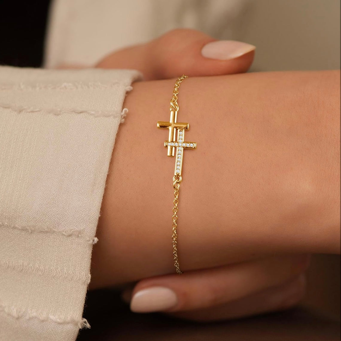 14k Gold Silver Double Cross CZ Bracelet – Adjustable Faith & Sparkle Ladies Gift